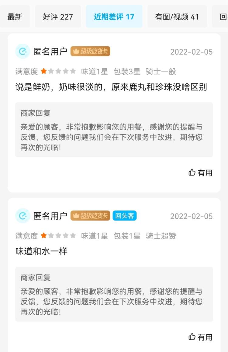 在“鹿角巷(莘庄总店)”山寨店的评价中,几乎没有顾客提到真伪问题,227条好评,17条差评,差评多集中在“奶茶像水”“味道太淡”及配送等问题上。