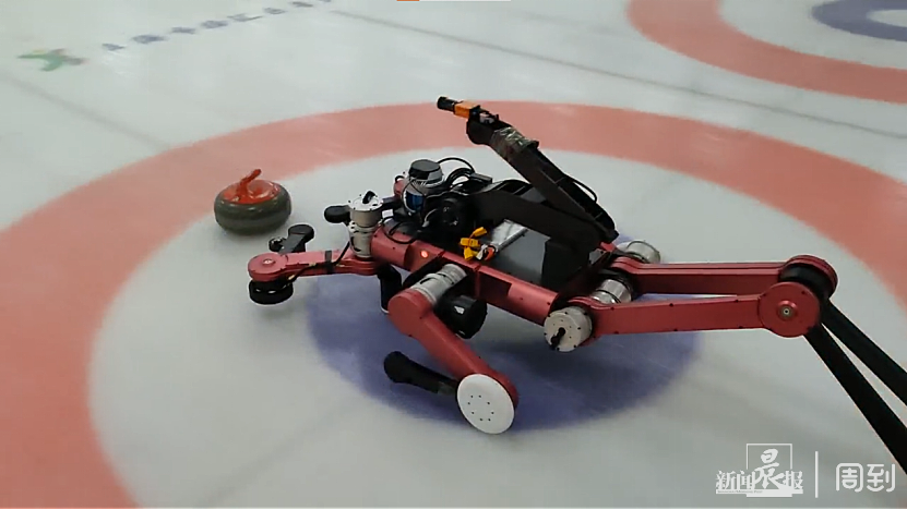 冰场上,它一双中“腿”支撑身体,一双后“腿”蹬踏起踏器,用一双前“腿”为双“手”控制冰壶的方向和移动与旋转速度,奋力一投,击中目标!观众拍手叫好。