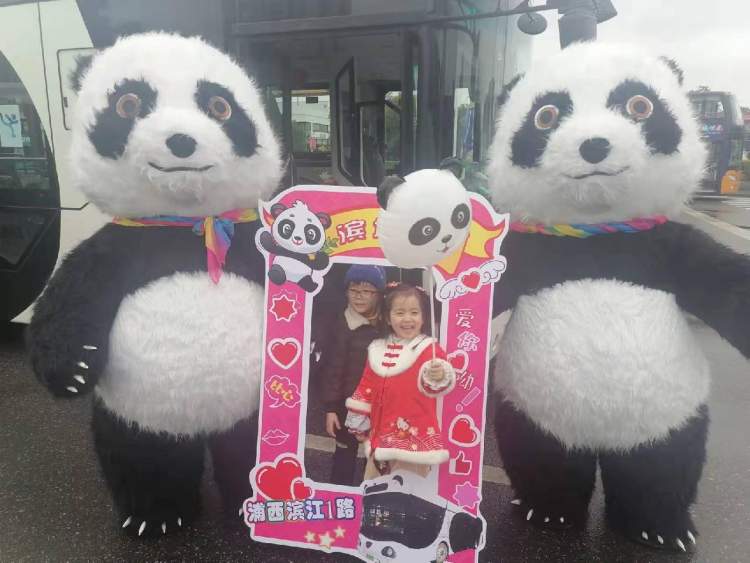 在黄浦江滨江附近的浦西滨江1路公交车站, 有两只憨态可掬的大“熊猫”在向人们搔首弄姿。