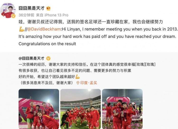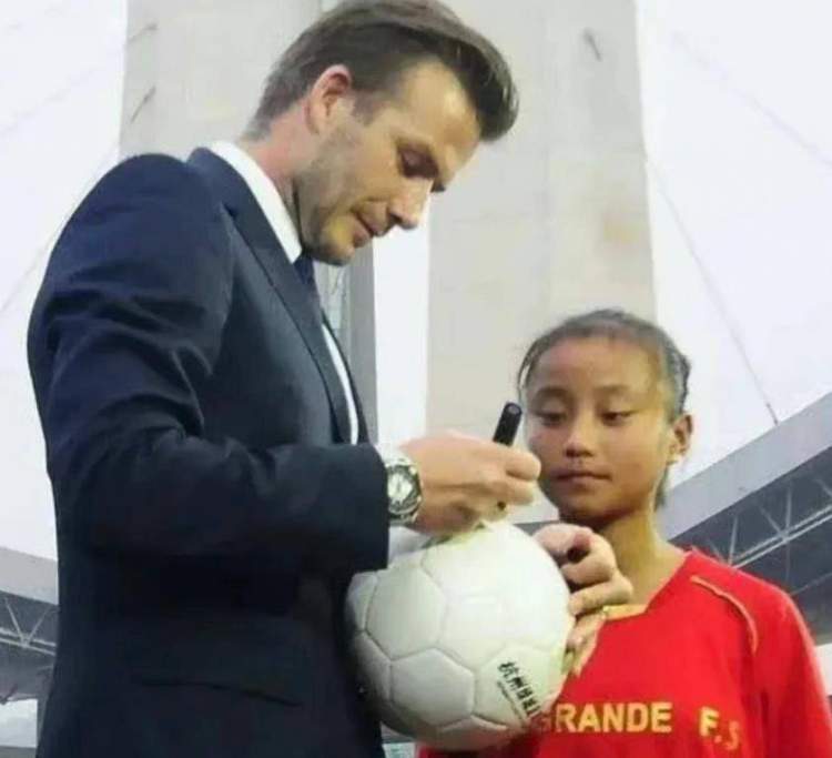 中国女足夺冠后,足坛巨星贝克汉姆也亲自“下场”,在社交媒体晒出当年小琳艳找他签名的旧照片,祝贺这位女足小将圆梦。