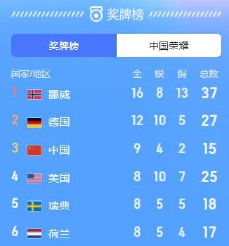 奖牌榜上,中国代表团创下金牌数、奖牌数历史最佳,以9金4银2铜位列第三位。这也是亚洲国家首次在冬奥会上挤进前三名。