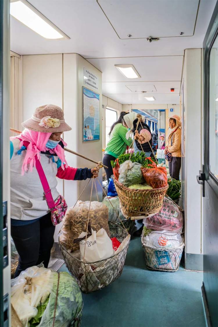列车刚到照福埔站停车,成群的老乡肩挑手提各色蔬果、肉类等农副产品,争先恐后地拥上车厢。还没等发车,菜农们的箩筐便摆满了整个过道。