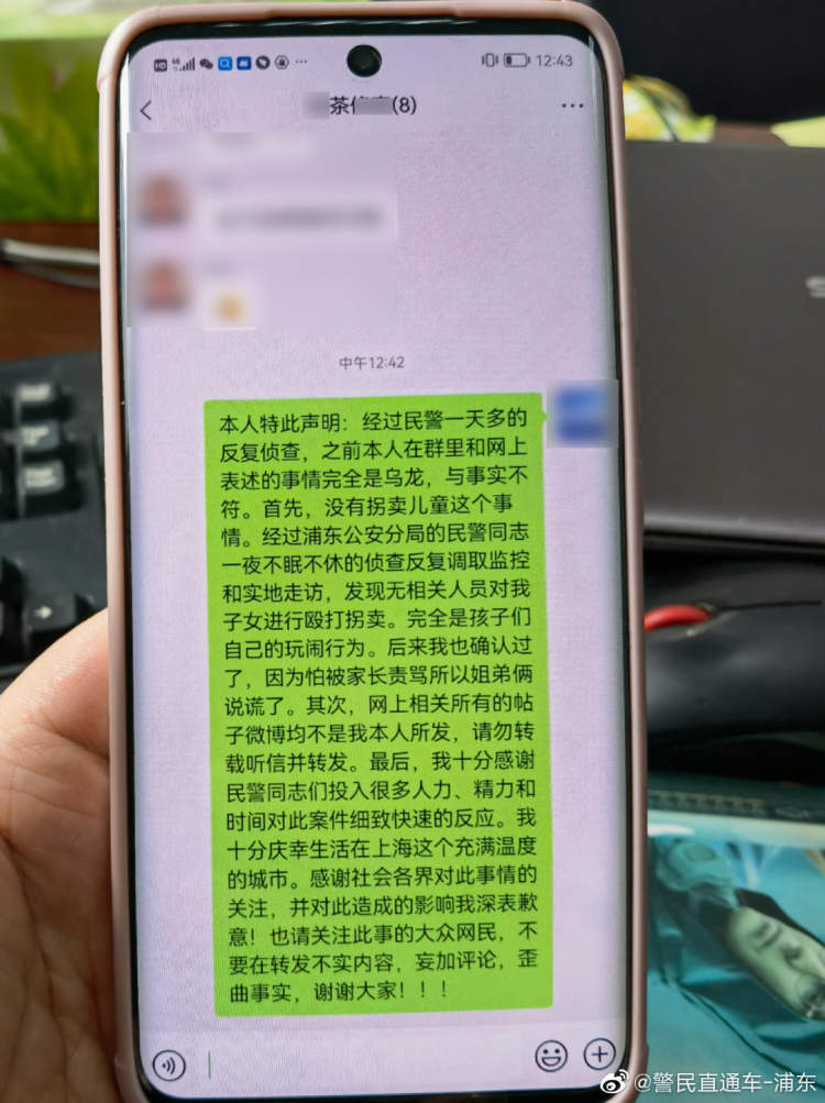 接报后,浦东警方高度重视,立即组织精干警力开展全面调查。经调取事发地及周边大量监控和实地走访后查明,系该男孩在玩耍一根大理石条过程中,不慎擦伤自己头部,为逃避父母责备,和姐姐共同编造了上述情况。家长在未弄清事实的情况下,将该信息发至微信群中,现已自行澄清。