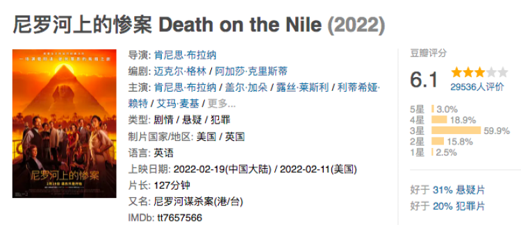 问题出在了哪呢?归根结底还是与新版《尼罗河上的惨案》口碑惨淡息息相关。