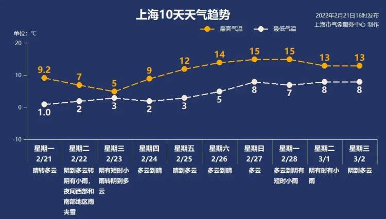 阴雨天气短暂回归 ,申城升温通道周末打开 周到君 2022-2-22 来源:周到上海 今天本市阴到多云,夜里转阴有时有小雨,今天半夜到明天早晨西部和南部地区有小雨或小雨夹雪,明天下午转阴到多云。北到东北风3-4级,明天中午转4-5级。今天最高温度7度,最低温度2度。今天相对湿度45%-80%。此次阴雨天气只是短暂回归,主要以小雨量级为主,但体感上湿冷比较明显,还是要注意防寒保暖。 短暂阴雨过后,申城将迎来一波难得的晴好天气,以晴或多云为主,气温步入快速上升通道,周日最高气温可升至15℃附近。 来源:周到上海 作者:周到君 赞一个 (0)