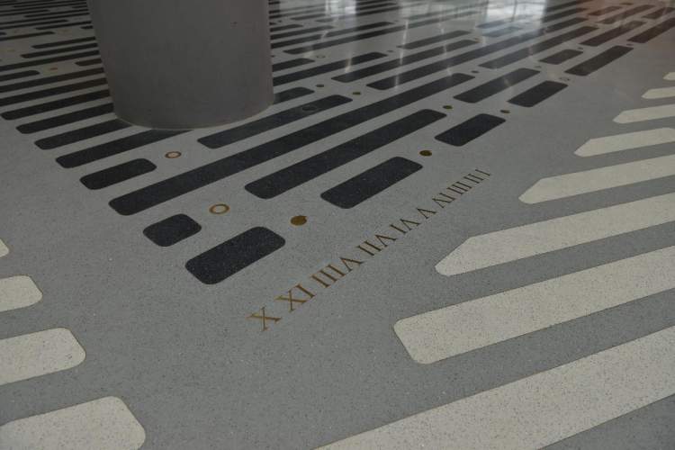 该作品在造型上与东馆主体建筑遥相呼应。置于敞开的室外公共空间,隐喻文明与自然共依共生。