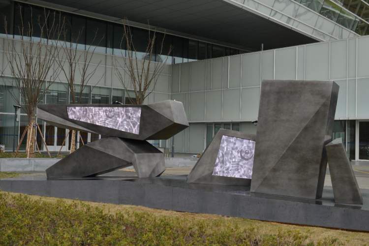 郑重宾《飞石》装置中的LED屏幕可播放外界景物的实时影像,观者可在数字影像中能动地构筑自己的感知模式。