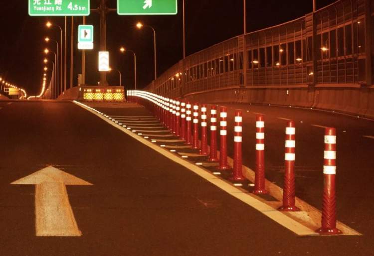 虹梅南路高架道路隔离设施警示标识的安装,遵循了绿色低碳、简约环保、经济耐久的原则,采用高性能的逆反射材料,选用耐弯折易养护的警示柱,降低维护成本;施工上采用成熟的胶粘方式或胶粘辅助方式,减少对路面的损害;采用全方位立体化设计和施工,警示效果显著,同步提升了全天候的养护理念。