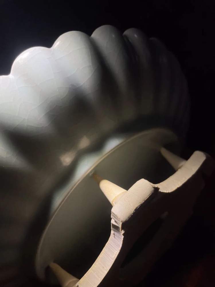 顶部有3个小开口像花瓣一样,底部边缘处则有5个极细小、好似芝麻状的支钉,这些都是支钉支烧留下的痕迹。