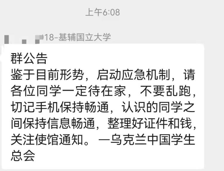 “我目前在基辅的家中,凌晨五点多我就听到了警报的声音。当地时间早上六点多,我收到了嘱咐我们不要乱跑、保证手机畅通的通知。”