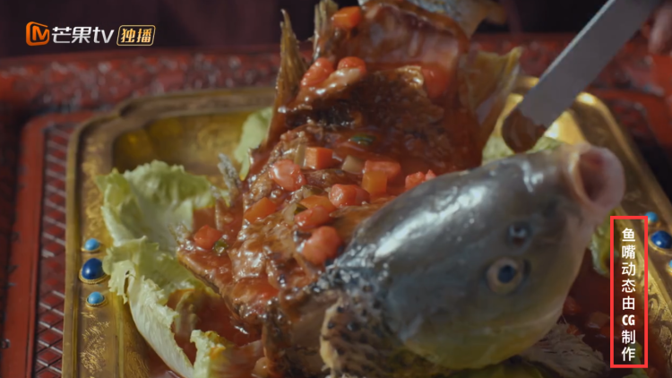 值得玩味的是,或许是为了避免引发“动物虐待”的争议,《尚食》中糖醋鱼上桌后鱼嘴尚能活动的场面,特意标识了“由CG制作”。