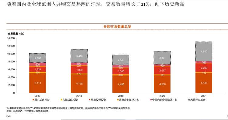 普华永道预计,2022年中国企业并购交易可能继续保持较高水平,主要得益于国内经济持续转型,以及财务投资者待投资资金达到历史最高。预计2022年境内并购交易数量将与2021年大致相当或略低于2021年,私募股权基金投资亦如此。