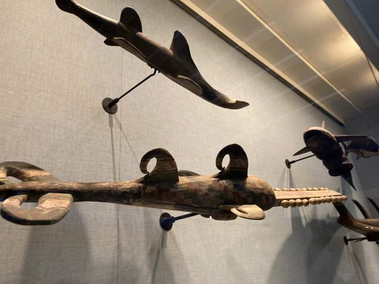 来自百年前尼日利亚南部尼日尔三角洲地区伊乔人使用的动物装饰面具,是各种鱼形的木雕,跟中国古代鱼形雕刻不同,这里的木雕都是大型鱼类,比如鲨鱼、锯鳐、螃蟹等。木雕下部有柳条帽子,舞蹈者头戴木雕在特定的时节中出现在公众场合,以表达对水的信仰。