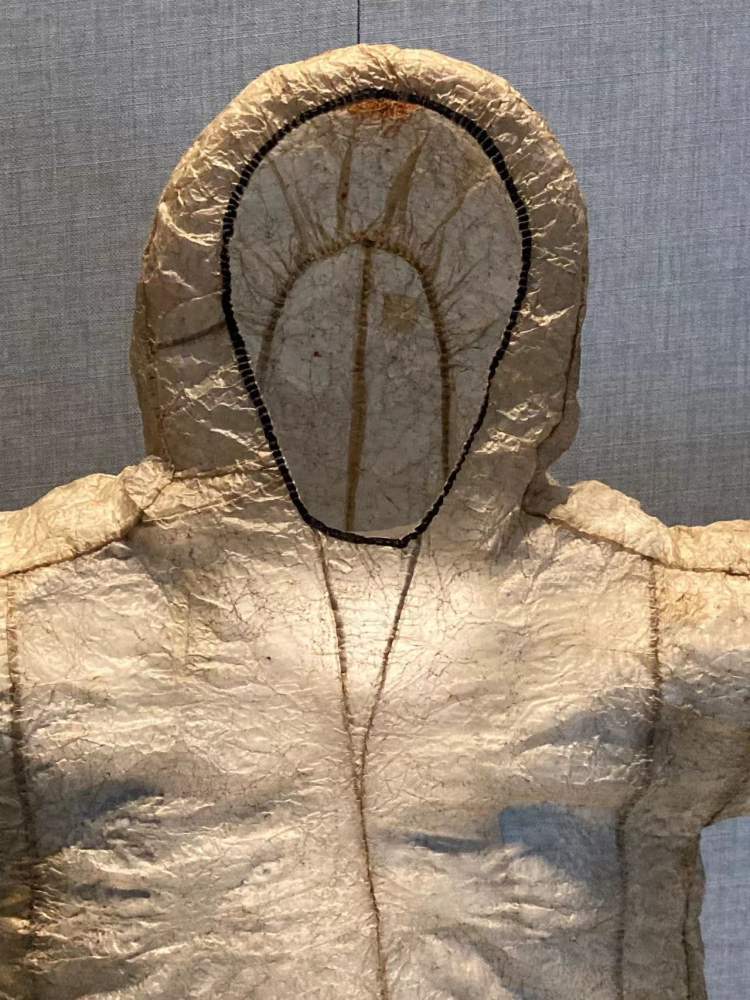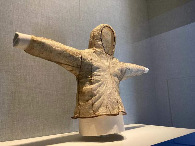 展厅中有件儿童雨披,是20世纪初美国阿拉斯加地区因纽特人或尤皮克人用海豹肠和皮革所制。这种雨衣由可拉伸的海豹肠以直角的形状缝制而成,完全防水。不过这样的雨批也看得人心惊肉跳。