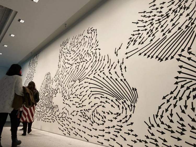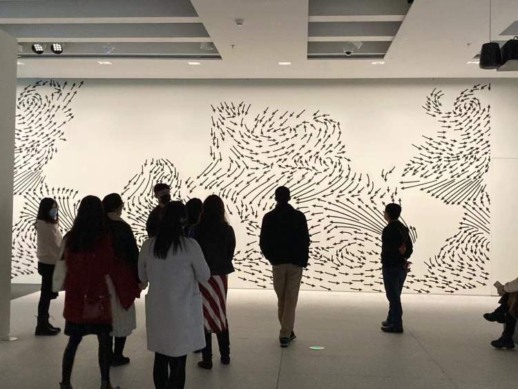 在法国艺术家贝诺·毕洛特的作品《飘》中,硕大的展墙仿佛是一页纸,洋流以箭头的方式在流动,大陆被抹去,地图的功能被消解,观众在迷茫中体会到人类的渺小。