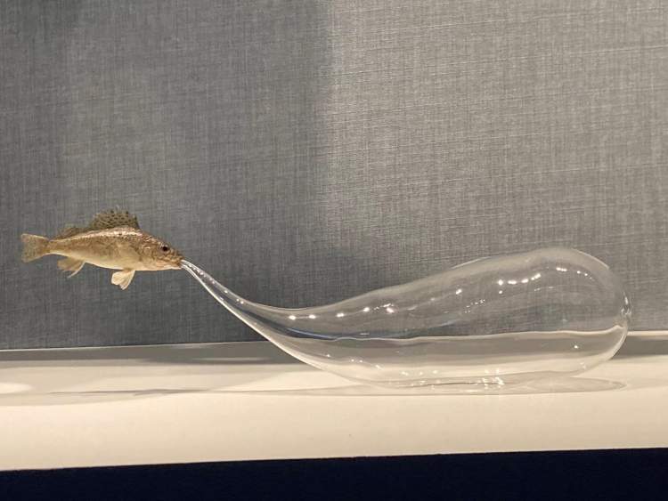 几件当代艺术品也跟鱼形木雕、鱼篓、鱼钩等文物并置陈列。由鱼类标本和吹制玻璃制成的雕塑《吹》,作者向我们展示了一条鱼的呼吸,通过将玻璃气泡连接到浑然天成的鱼嘴孔洞,让不可见的呼吸变得可见。