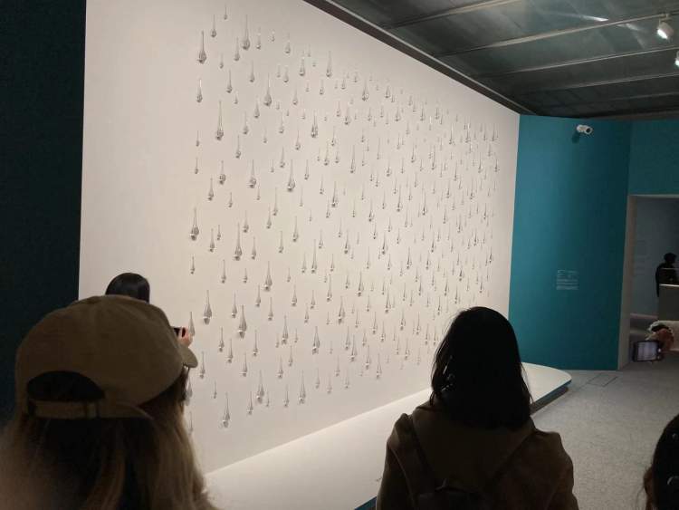 阿尔及利亚艺术家埃莱娜·穆格用400件大大小小的水晶泪滴固定于墙上,组成了一面《泪墙》,水晶的耀眼和脆弱,使人感动,也使人恍惚,艺术家让水晶反射光芒,也将物理之光引向精神之光。