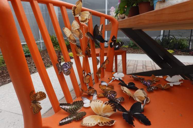 原来,室内园圃是高温高湿环境,不仅让柠檬树反季开花,还让蝴蝶的标本栩栩如生。以各种形式布置的蝴蝶在透明球里,在椅子上,在相框里……