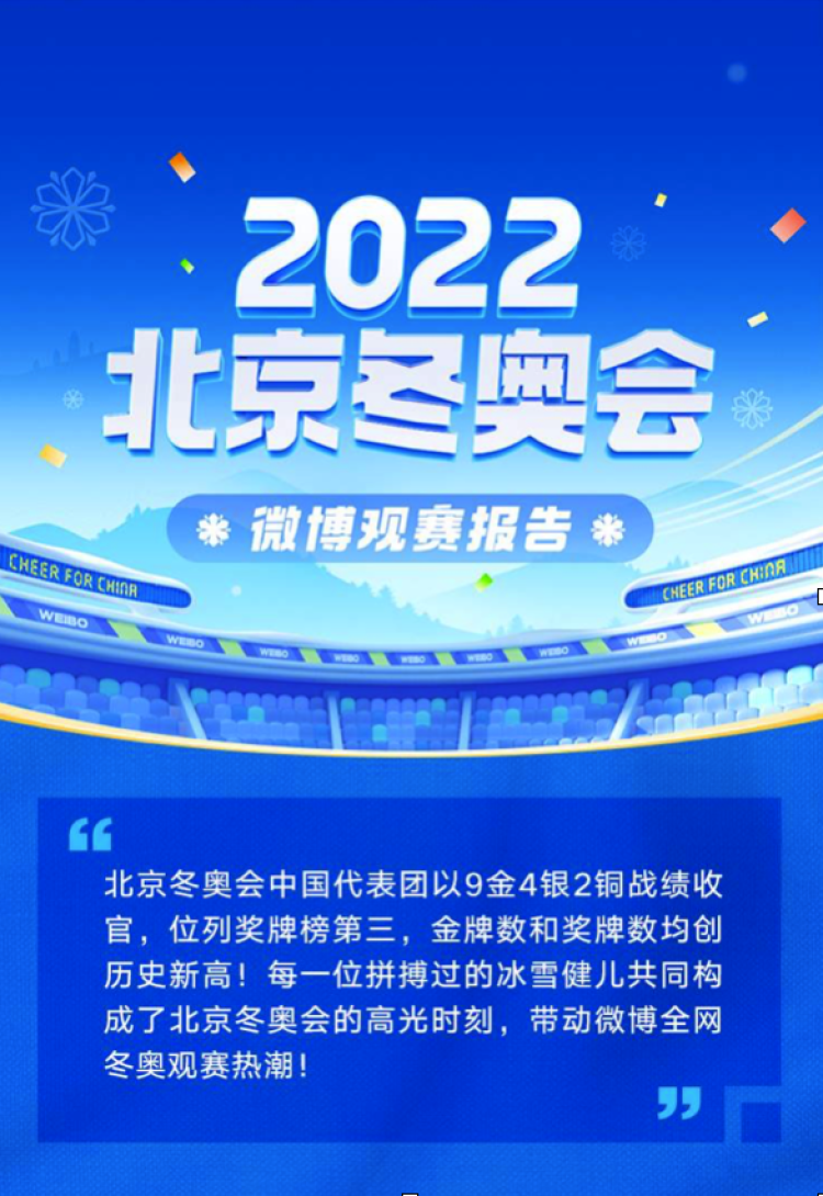 体育大年的首场盛宴近日落幕。2022年北京冬奥会期间,主场作战的中国代表团以9金4银2铜的战绩创下了自1980年参加这场赛事以来的最好成绩。作为用户围观和讨论重大体育赛事的核心平台,微博凭借运动员为代表的完整体育矩阵,以“热点+社交”模式的驱动,成为全网冬奥风向标。
