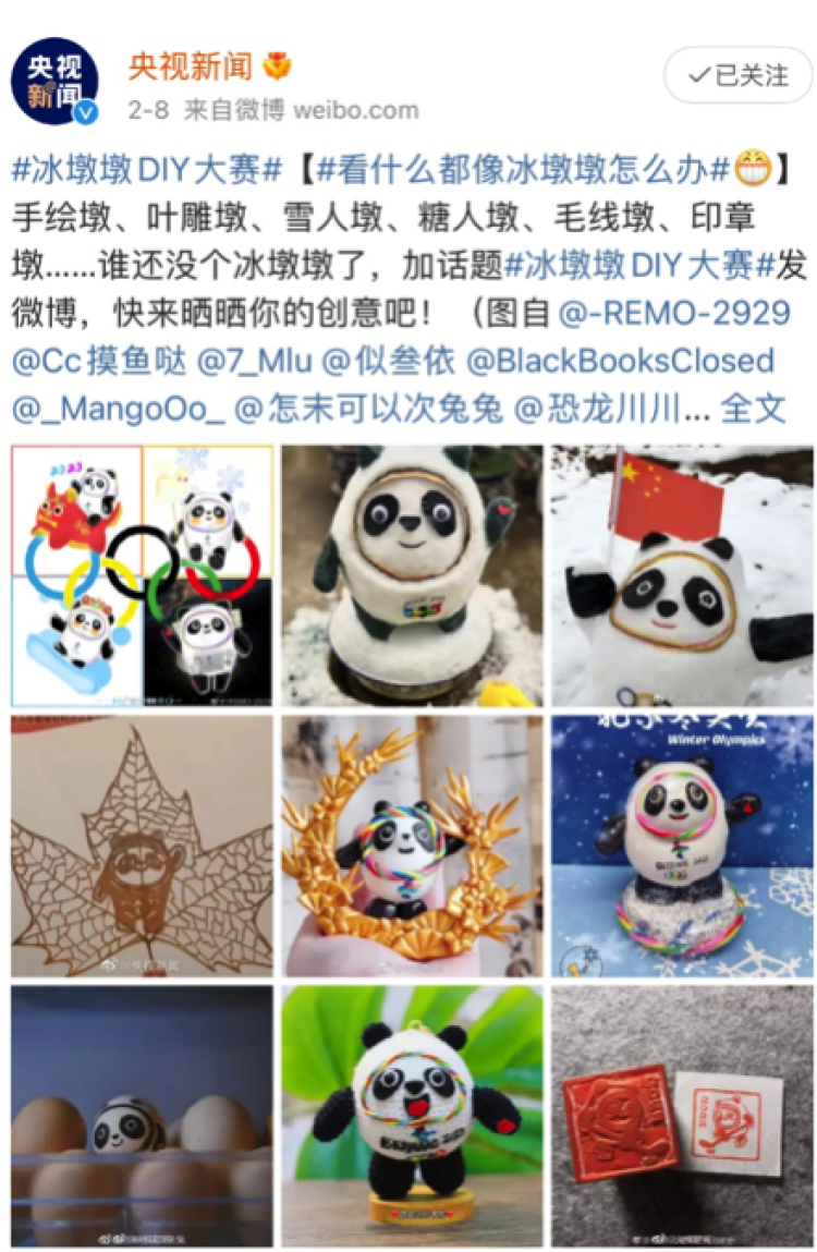 作为顶流的冰墩墩同样是造梗机,由于销售异常紧俏,一“墩”难求的说法火爆全网。在这期间,央视新闻官微在微博平台掀起“冰墩墩DIY大赛”,吸引了众多微博大V和用户参与。插画师白茶在微博上晒出了其“设计”的冰墩墩猫包,清华大学也秀出了大学生画出的冰墩墩,更多的用户晒出了刺绣、印章、饼干、元宵,甚至是橘子做的冰墩墩,“橘墩墩”甚至登上热搜首位。