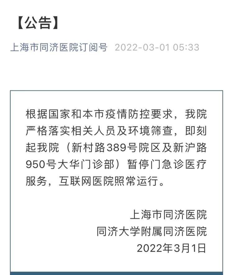 最新!即刻起上海市同济医院暂停门急诊医疗服务,互联网医院照常运行 陈里予 2022-3-01 来源:周到上海 今天早上,上海市同济医院发出公告, 根据国家和本市疫情防控要求,我院严格落实相关人员及环境筛查,即刻起我院(新村路389号院区及新沪路950号大华门诊部)暂停门急诊医疗服务,互联网医院照常运行。 来源:周到上海 作者:陈里予 赞一个 (0)