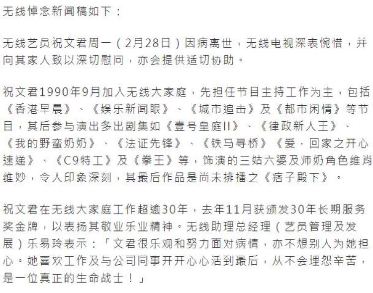 2月28日,香港女星祝文君因肺癌逝世,终年55岁。她曾在周星驰电影《食神》中扮演记者,现实中她是香港娱乐圈的人气主持人兼TVB演员。