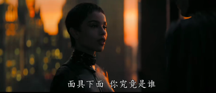 佐伊·克拉维兹饰演的猫女则发出疑问:“面具下面,你究竟是谁?是你伤痕累累的脸吗?”