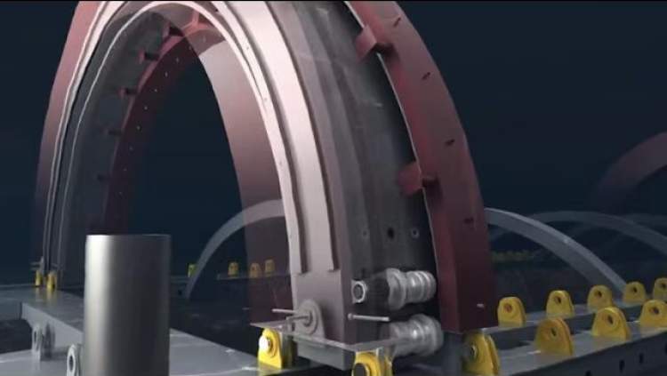 那么如何把22根梁精确地组合成一个半圆柱体呢?周东荣说,我们运用了锁扣结构,每根梁之间用锁扣来相互铰接在一起,确保精度在5毫米之内。