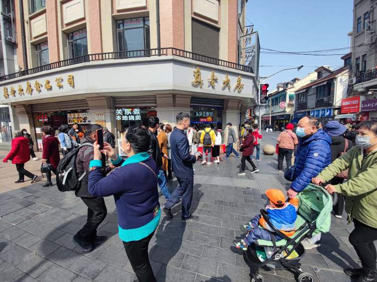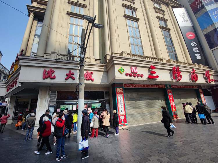 尽管是周中工作日,南京路上两家老字号顾客盈门,十分热闹:沈大成的外卖窗口拥着许多来买糕团的顾客,店员不时将堂食的顾客引向二楼;真老大房门前,两种口味的青团让顾客排起了队……不时有顾客来问问询:“你们是要关了吗?”一旁的三阳南货店卷帘门已经拉下……