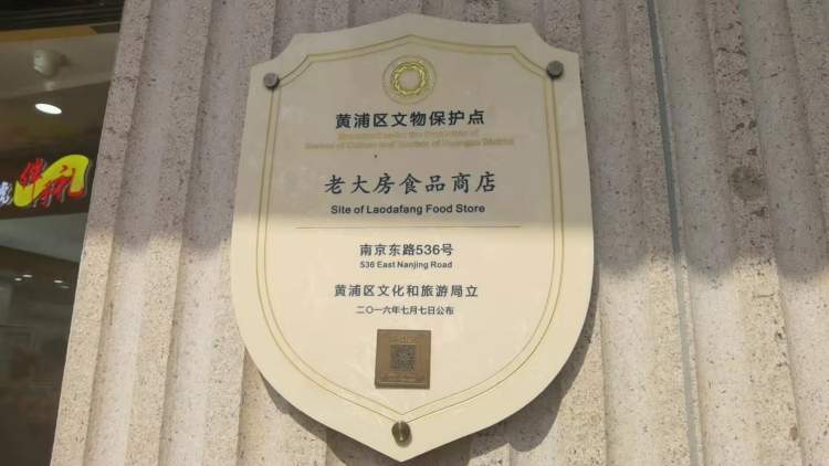 红牌子底下是真老大房门店,墙上还挂有一块铭牌,显示该店是被黄浦区文化和旅游局列入黄浦区文物保护点的“老大房食品商店”。