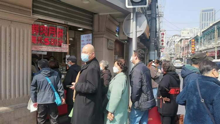 鲜肉月饼柜台除了月饼,现在还有黑洋沙、咸蛋黄肉松两种口味的青团卖,顾客在路口转角排起了队。