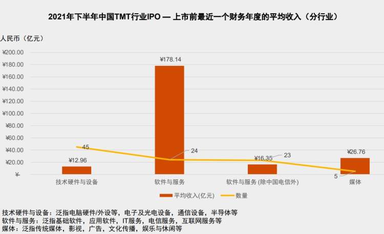 据普华永道统计,2021年下半年内地科技、媒体及通信(TMT)企业IPO数量较2021年上半年的78起有所下降,共74起,融资总额约人民币1507亿元。其中在国内主板上市的中国电信(融资额479亿人民币)为2021年下半年最大的内地TMT企业IPO。