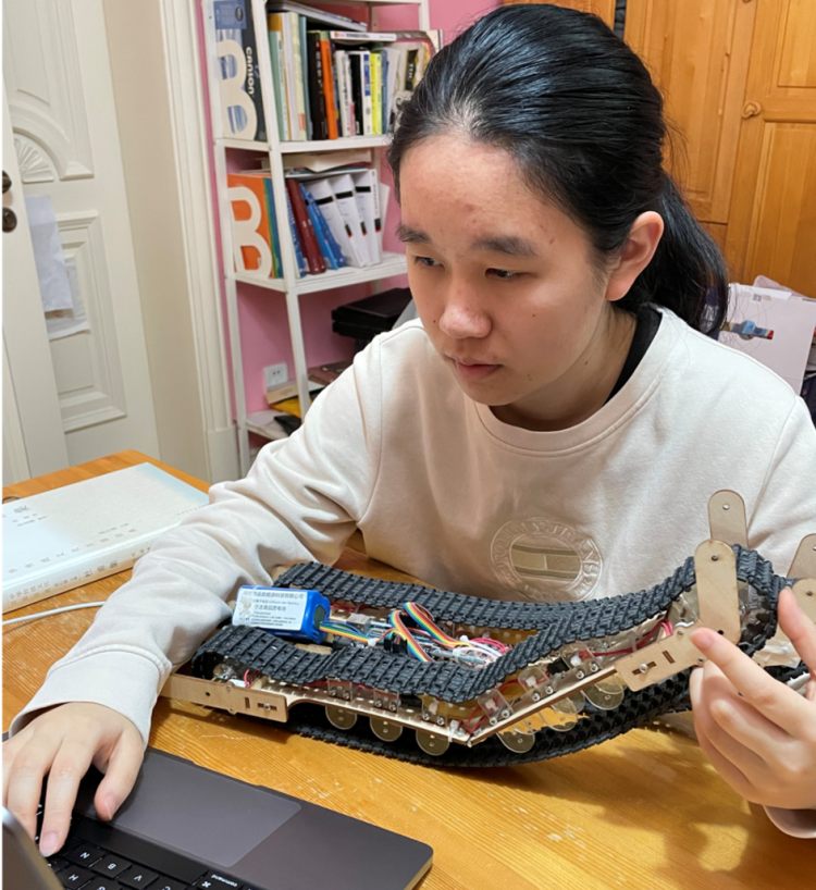 九年级的那个暑假,盛嘉容对救灾机器人产生了兴趣。她加入英才计划,深入学习工程学,最终设计出了一款“半柔性可变形履带仿生爬虫机器人”。