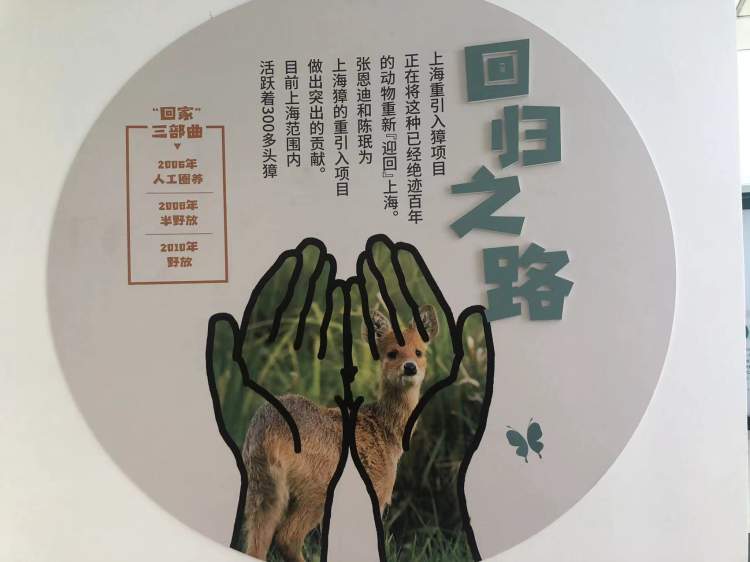 整个科普场馆体现了环保理念,泡沫塑料变废为宝,成为一幅獐的抽象画。当然,科普馆里最重要的还是讲述獐在上海灭绝百年后的回归之路。16年前,在华东师范大学教授张恩迪、被誉为“獐妈妈”的陈珉副教授等许多人的共同努力下,獐这种动物逐渐在上海开枝散叶,恢复种群。