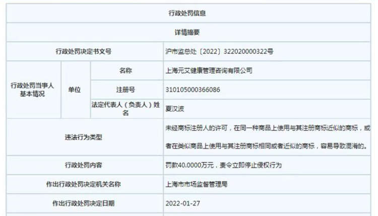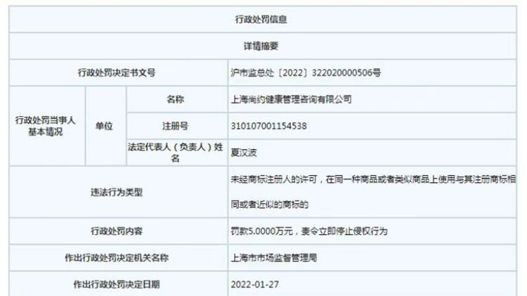 上海市市场监管局在处罚决定书中表示,鉴于当事人案发后自行拆除涉案服务标识等因素,依据《中华人民共和国商标法》第六十条第二款“工商行政管理部门处理时,认定侵权行为成立的,责令立即停止侵权行为,没收、销毁侵权商品和主要用于制造侵权商品、伪造注册商标标识的工具,违法经营额五万元以上的,可以处违法经营额五倍以下的罚款,没有违法经营额或者违法经营额不足五万元的,可以处二十五万元以下的罚款。对五年内实施两次以上商标侵权行为或者有其他严重情节的,应当从重处罚。销售不知道是侵犯注册商标专用权的商品,能证明该商品是自己合法取得并说明提供者的,由工商行政管理部门责令停止销售”之规定,决定责令当事人立即停止侵权行为,并从轻处罚,对长宁区上述两家门店分别罚款40万元、30万元,对普陀上述门店罚款人民币 5 万元。
