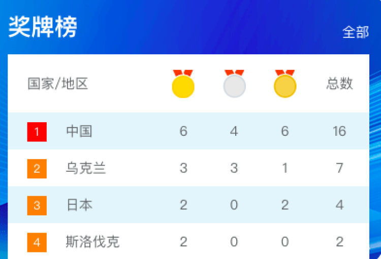 乌克兰、日本和斯洛伐克分列奖牌榜第二至第四位。