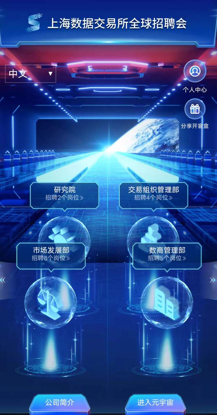 在上海数据交易所元宇宙招聘大厅,来自全球的应聘者可以在线沉浸式地浏览公司介绍、岗位信息、投递简历。应聘者可以通过参与互动获得具有纪念意义的上海数据交易所首发数字藏品。