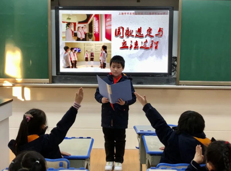 上海市市东实验学校是杨浦区一所十二年一贯制的公办学校。下午三点半,在参加课后服务的低年级小朋友们迎来了“思政讲堂”。学校高年级的学生走进低年级教室,带来“思政行走课堂”衍生版。他们用多样的形式,将自己在国歌展示馆的所见所闻、所思所感传递给低年级小朋友。