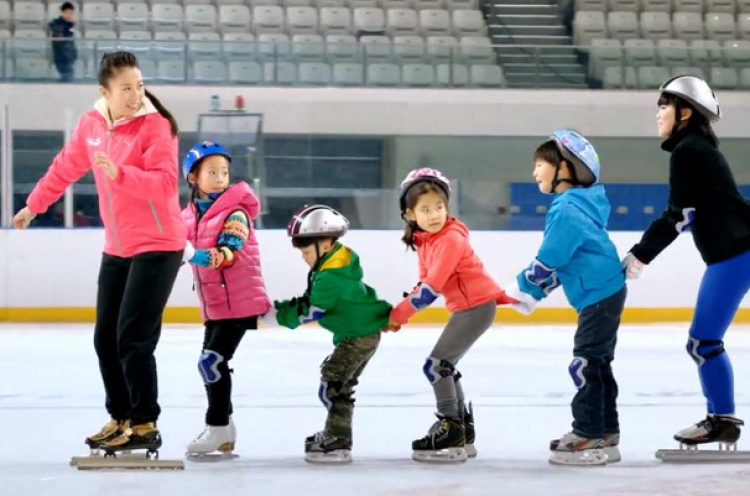 ■ 临沂二村小学的学生们在“冰雪女王”杨扬老师的带领下进行冰上练习