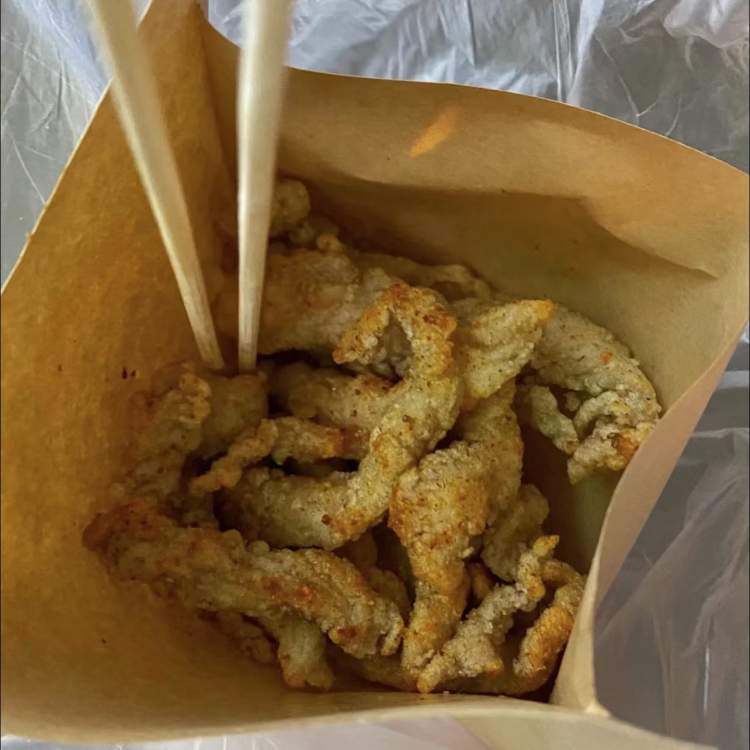 卖得最好的还是童年常吃的香酥鸡,如果不排队的话一分钟不到就做好了。抓一把鸡柳、称重、下油锅,一通熟悉的操作。从热油里捞起来,放入纸袋中,香味会迫不及待地钻出来,撒上五香粉、胡椒粉再加一点香辣粉,趁热咬上一口,超级过瘾。不管是吃上去还是闻起来,都和小时候一样。唯一不一样的是价格见涨,小时候几元一袋的香酥鸡,现在要到13元一袋。