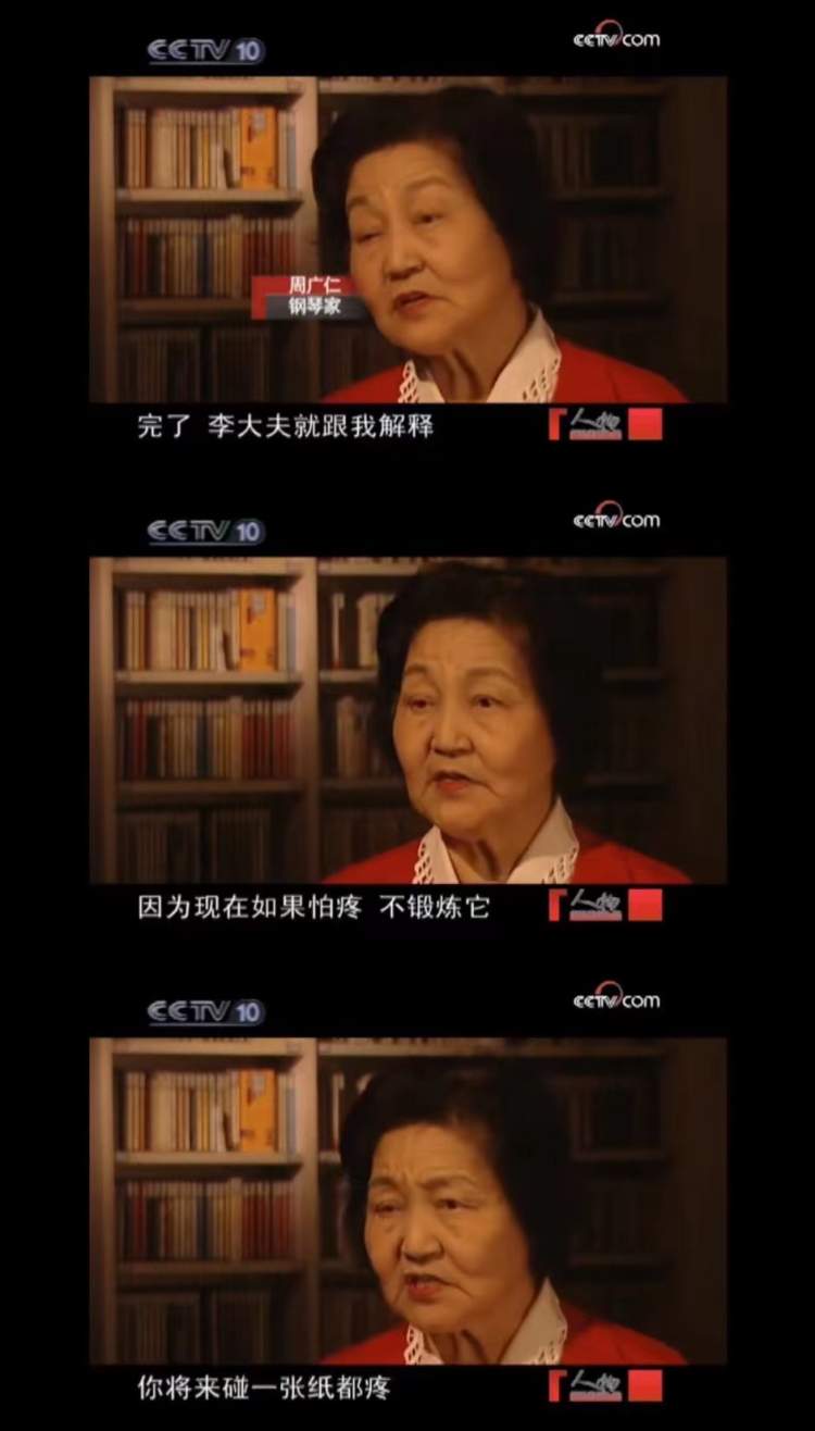 后来的康复过程中,医生告诉周广仁需要不断刺激手指以恢复手部机能。于是她出院第三天就忍着疼痛开始练琴,每天都以泪洗面。