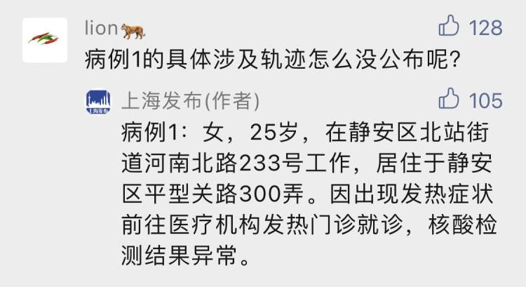 上海发布回应:病例1:女,25岁,在静安区北站街道河南北路233号工作,居住于静安区平型关路300弄。因出现发热症状前往医疗机构发热门诊就诊,核酸检测结果异常。