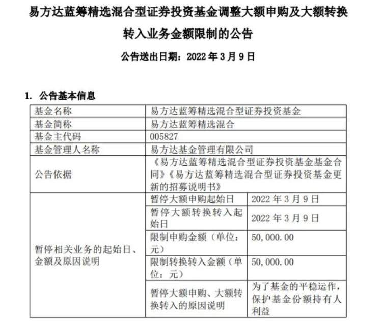 3月9日,易方达基金发布公告,张坤在管的两只规模最大的基金易方达蓝筹精选基金、易方达优质精选基金(原名易方达中小盘)再度放开限购,限额由此前的1万元提升至5万元。