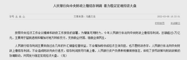 3月8日人民银行网站发布,按照中央经济工作会议精神和政府工作报告的部署,为增强可用财力,今年人民银行依法向中央财政上缴结存利润,总额超过1万亿元,主要用于留抵退税和增加对地方转移支付,支持助企纾困、稳就业保民生。