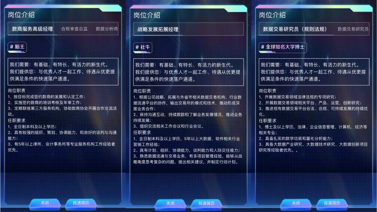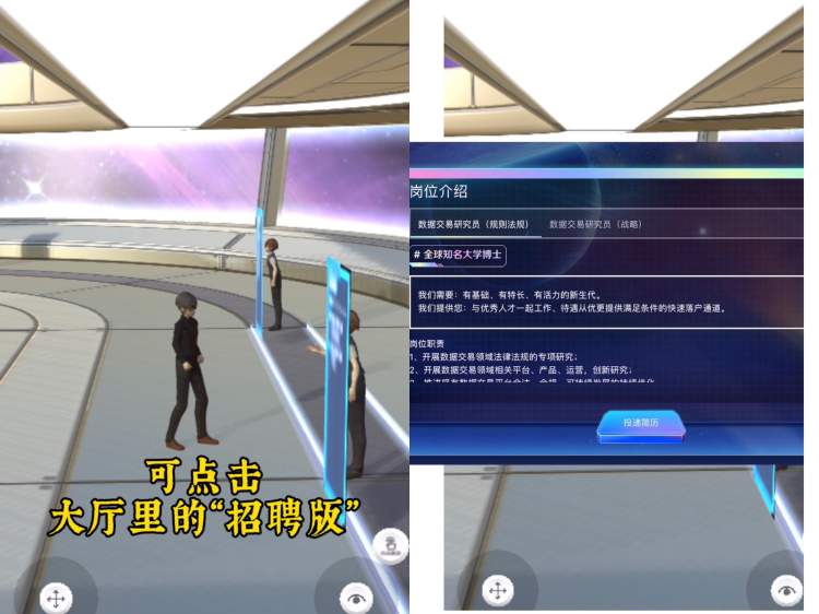 在元宇宙大厅里,摆放了几块招聘板,点击页面,就可以跳出招聘的岗位信息,用户可以由此递交简历。
