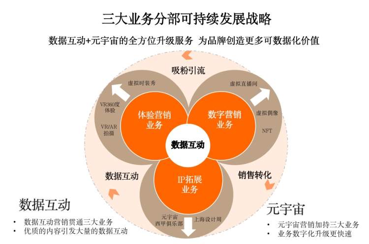 艾德韦宣表示,坚持以“内容+营销+科技”和“内生增长+外延并购+多变创新”的战略模式发展,同时加大数字化和创新布局,因此2022年1月投资入股中国虚拟内容制作领军企业北京为快科技集团,并与其旗下公司北京为快科技有限公司成立合营公司,共同打造泛时尚元宇宙营销新领域,为品牌提供“线下活动+在线数据互动+元宇宙”的一站式营销服务。