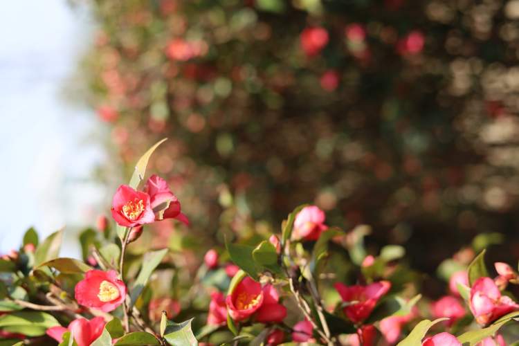 盆景园里的束花茶花更为精致可爱。主角是‘枚玉’和‘玫瑰春’,削得整整齐齐的花篱和背后的中式园林布景相映成章。上海植物园科研中心肖老师告诉周到君,它不仅可以观花,还能观叶——因为修剪频繁,茶花的叶子在生长旺盛期呈现大片的红色,非常好看。