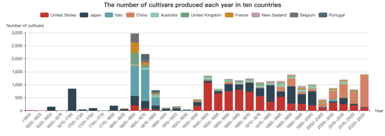不仅仅是束花茶花、连蕊花,中国本是山茶的家乡,拥有该属80%的物种。但是在培育物种这件事上,我们起步得比较晚。“世界山茶属植物品种数据库”显示,山茶属植物园艺品种总数第一是美国,其次是日本,中国居于第三。但是从千禧年开始,中国每年的新增数量升到了第一,目前共有3687种。