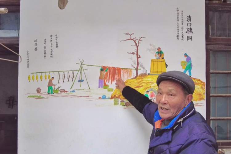 杨火根的渔民画工作室,也是他的家,就在老渔村中心的池塘边上。3月3日下午,记者走进通往他家的巷子,看见小巷两边的墙上都是他的手笔,画着几十年前渔村渔民们的日常生活场景:织网、扎网篬、修船、开排、撒网……一路走来,一路欣赏杨火根的渔民画,记者仿佛在这个渔村的现在和过去中来回穿越。