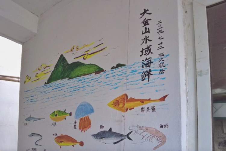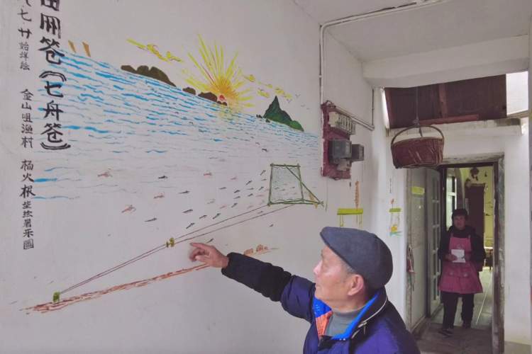 记者看到,在杨火根家的墙壁上,也画满了渔民的生活图景:金山近海出产的各种鱼虾蟹贝、渔场方位、捕鱼场景,以及海上风光等。他还在墙上记录了金山嘴的潮汐和台风方面的资料。对近几十年来,那些给渔民们造成重大事故的台风,更是无一遗漏。